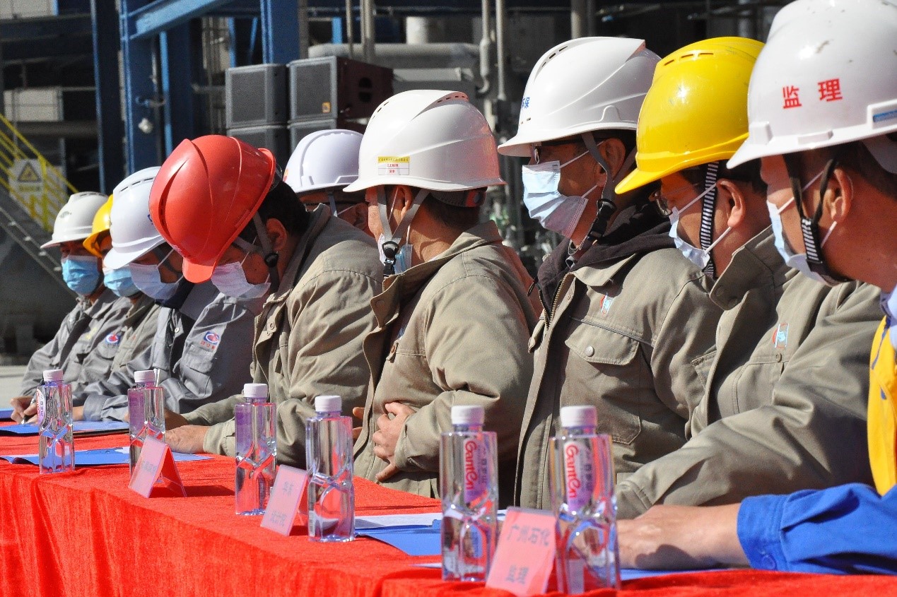 東粵環保總經理李恩泉、總工程師吳聿、開工總指揮張保存及東粵環保部分員工50余人參加此次會議。中化四建項目經理袁清溪、中化四建華南分公司經理邵治國、中化四建勞務分公司經理許青、中石油華東設計院經理謝恪謙、廣州石化總監席戰峰、廣東石化工程中心主任任志偉、工程師侯長勇列席參加此次中交儀式。