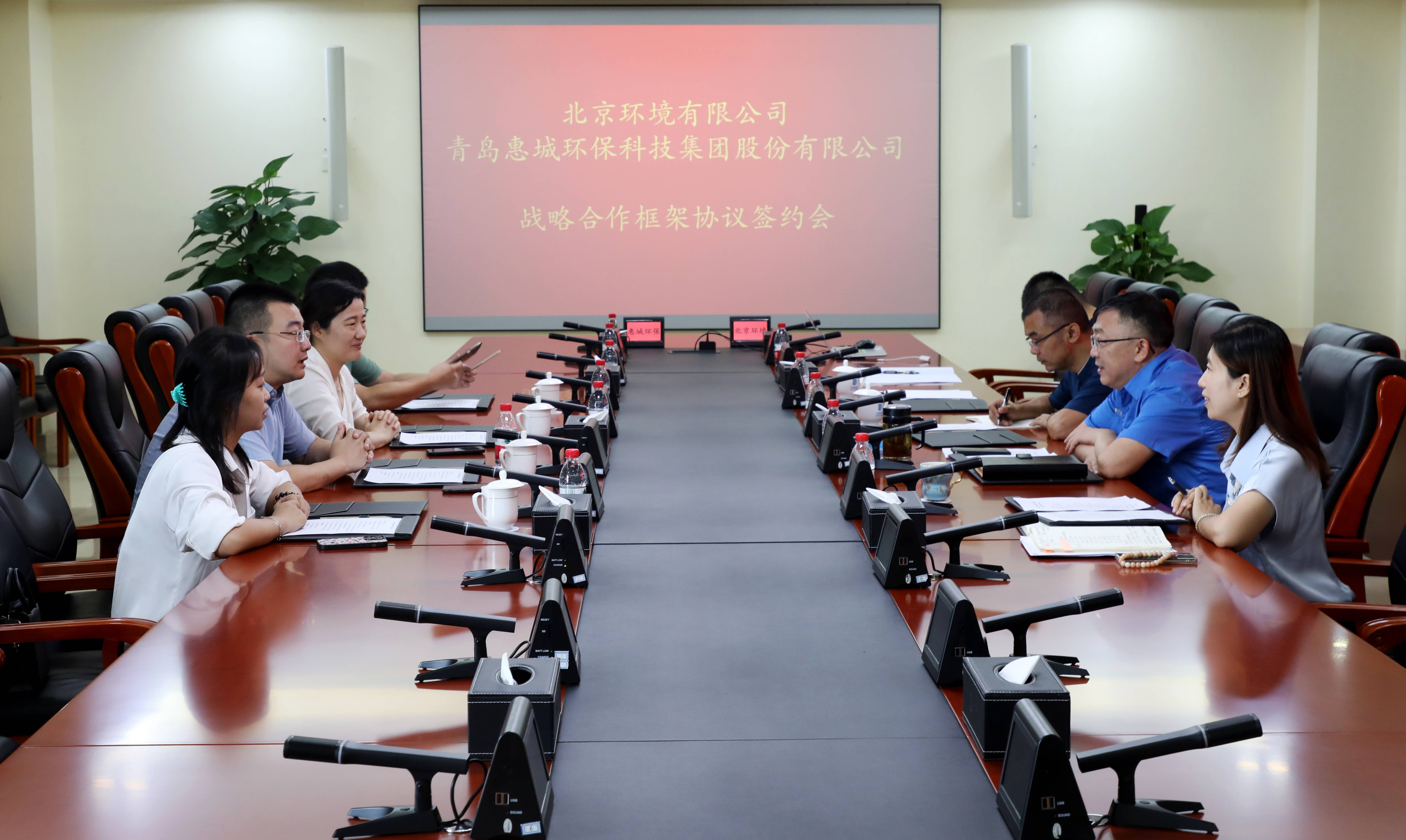 8月2日,青島惠城環??萍技瘓F股份有限公司(簡稱“惠城環?!保┡c北京環境有限公司(簡稱“北京環境”)成功簽署戰略合作協議,惠城環??偨浝砹皱?、北京環境總經理韓曉鵬代表雙方鄭重簽約,青島惠城環境科技有限公司(簡稱“惠城環境”)總經理張秋艷等出席會議。?